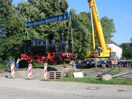 98 507 wird am 29. August 2005 in Ingolstadt auf ihren neuen Denkmalsockel gehoben. Foto: Manfred Uy.