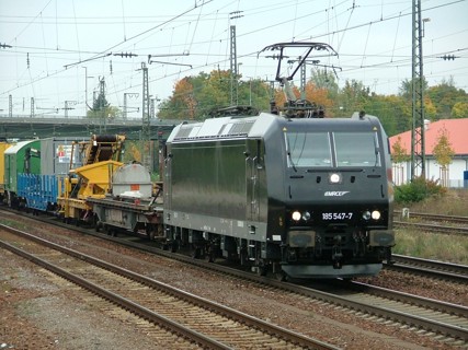 MRCE 185 547 fährt am 21. Oktober 2005 mit einem Bauzug für die PRESS durch Graben-Neudorf. Foto: Wolfgang Mauser