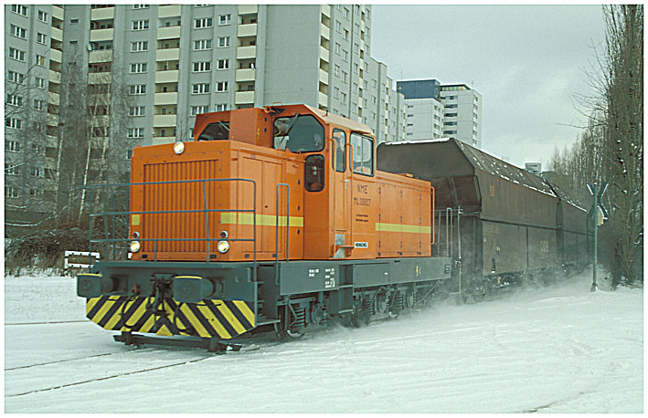 NME ML 00607 mit einem leeren Kohlezug in Berlin-Buckow, Kölner Damm am 3.2.1998. Foto: Dietmar Lehmann
