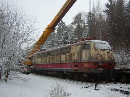 103 002 wird am 22. Dezember 2005 im Spatzenpark Hernried vom Tieflader entladen. Foto: Manfred Uy